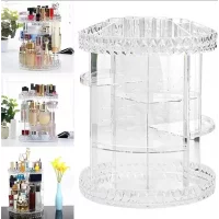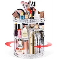 This stylish and practical makeup organizer features a 360° rotation that accommodates items of all sizes, including perfumes, lipsticks, and skincare products. Its transparent design provides visibility from every angle, which makes it ideal for dressing tables and makeup studios.