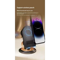 This is an H58 3-In-1 wireless sensing phone stand that features wireless charging, a 360° rotation design mobile phone holder, and a stereo speaker. It has a 360° rotating function that offers you the perfect viewing angle, and it has a built-in speaker that provides good sound quality via Bluetooth connectivity. Also, it has 5W–15W wireless charging output, RGB LED light, 4.5" to 12.9" device support, and 500 to 1000mAh battery capacity that gives a battery life of up to 3–5 hours.