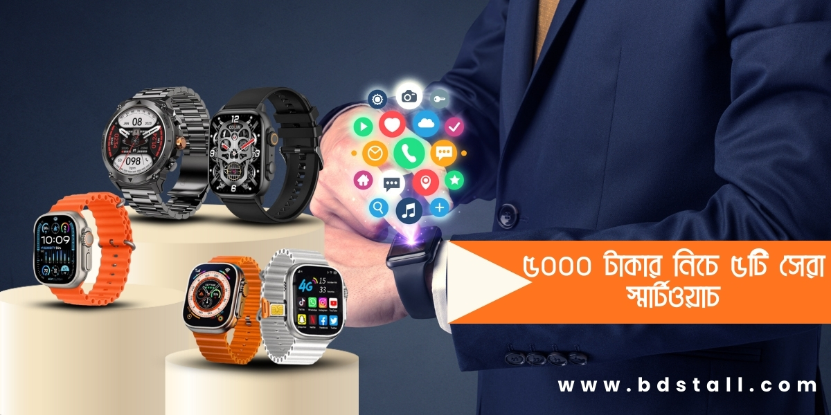 আমাদের দৈনন্দিন জীবনে অপরিহার্য একটা ডিভাইস হচ্ছে স্মার্টওয়াচ। কারণ এটি সাধারণ ঘড়ির ন্যায় শুধু সময় দেখার ক্ষেত্রে ব্যবহার হয় না, ফ্যাশন এবং স্বাস্থ্য সচেতনতার ক্ষেত্রে বেশ কার্যকর হয়ে থাকে। বর্তমানে, বাংলাদেশে ব্র্যান্ডের এবং নন-ব্র্যান্ডের অনেক স্মার্টওয়াচ পাওয়া যায়। ফলে, বাজেটের মধ্যে ভালো স্মার্ট ওয়াচ খুঁজে পাওয়া কিছুটা চ্যালেঞ্জিং হয়ে থাকে। তাই আমরা ৫০০০ টাকার নিচে ৫টি সেরা স্মার্টওয়াচ নিয়ে আলোচনা করব যা আপনার চাহিদা পূরণ করতে সক্ষম। তাহলে চলুন ৫টি সেরা স্মাটওয়াচ কি কি এবং তাদের ফিচারসমূহ সম্পর্কে বিস্তারিত জেনে নেয়।